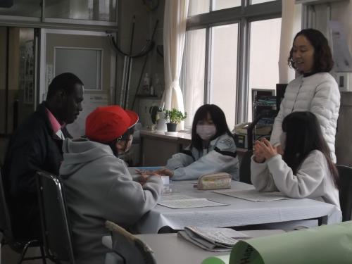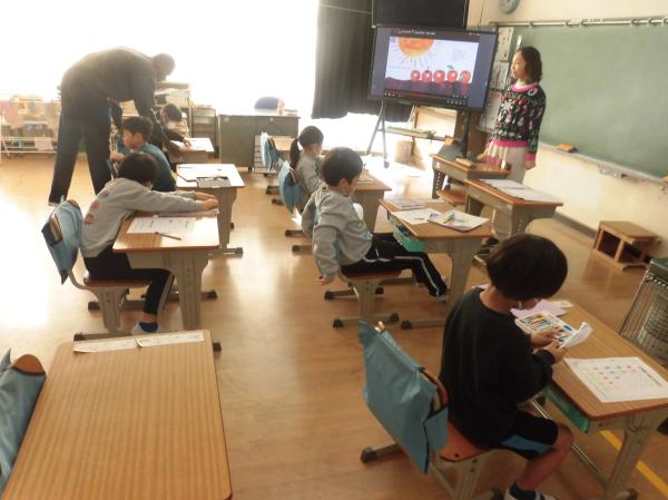 休み時間にEnglish Dayに参加する児童が英語専科教員、ATLと一緒に練習をしています。学校代表として頑張ってください!