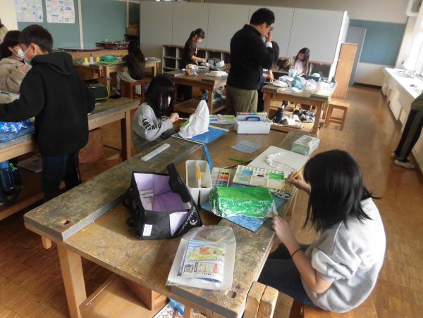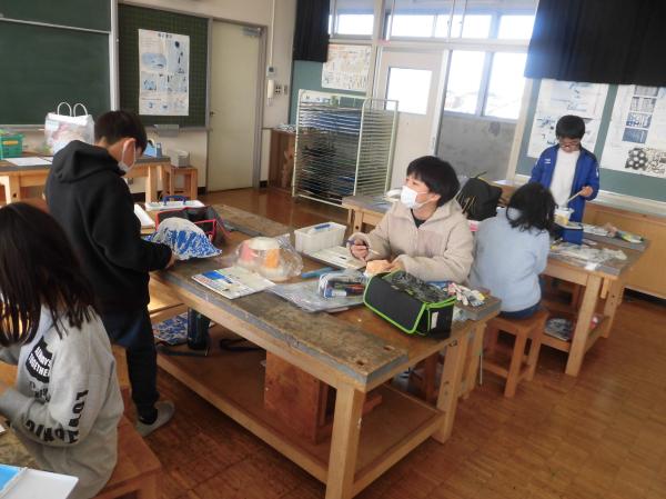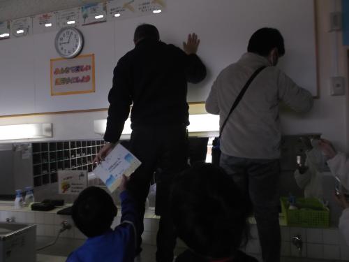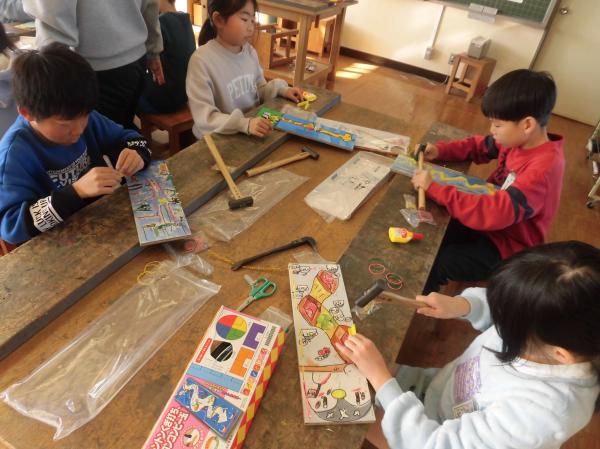 3年生が金槌を使ってトントン釘を打ち、ビー玉が転がるコースをつくっていました。学校公開日であり、たくさんのお家の人に参観していただきました。