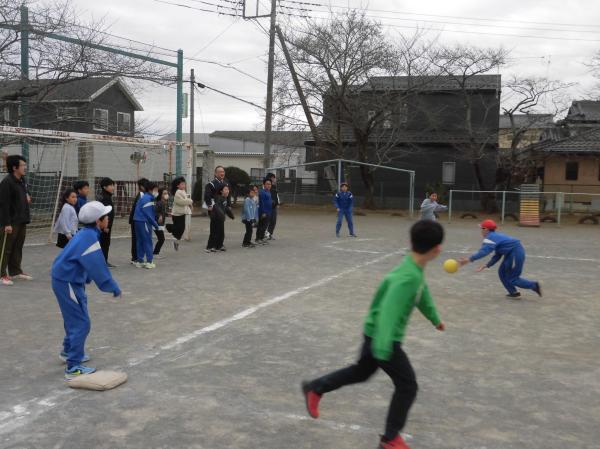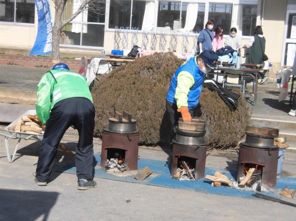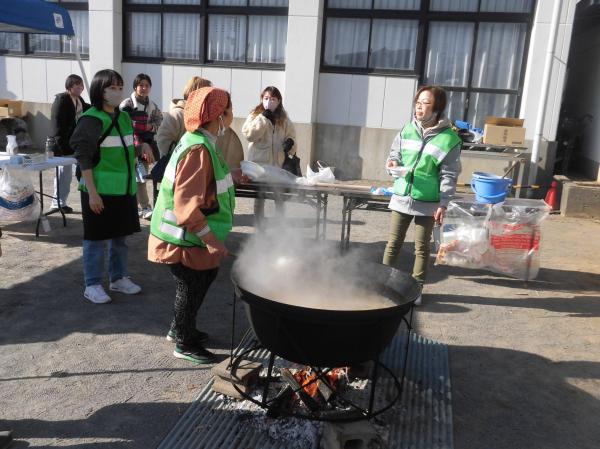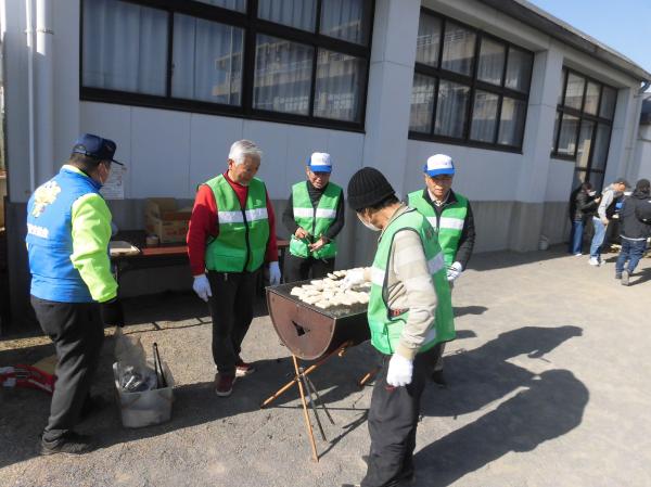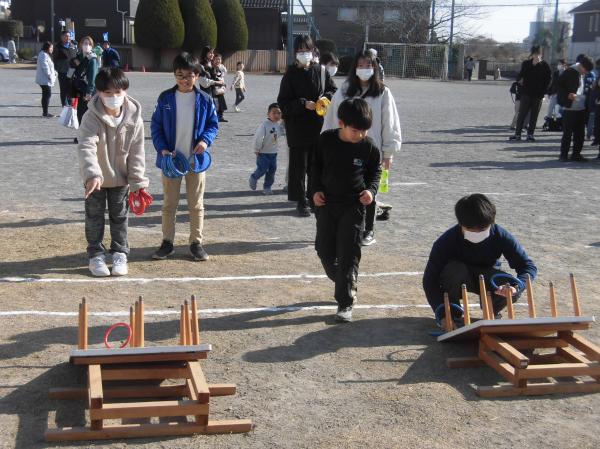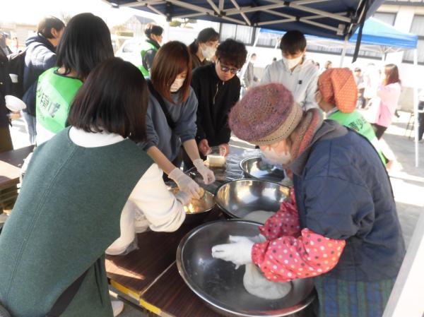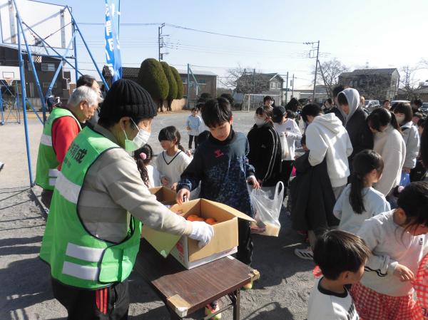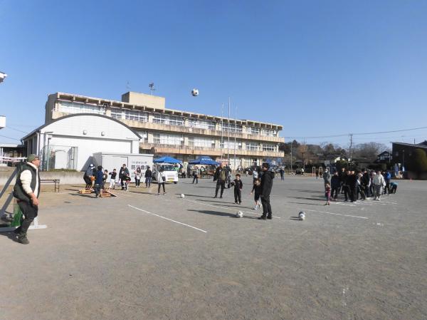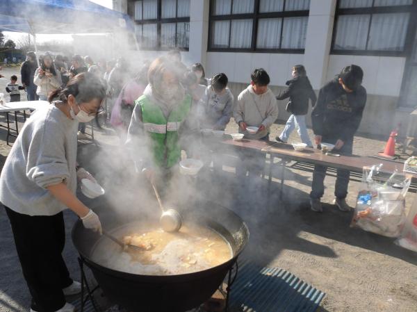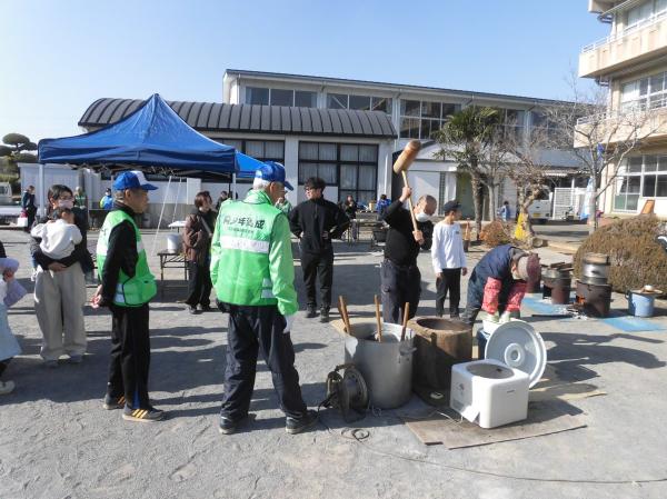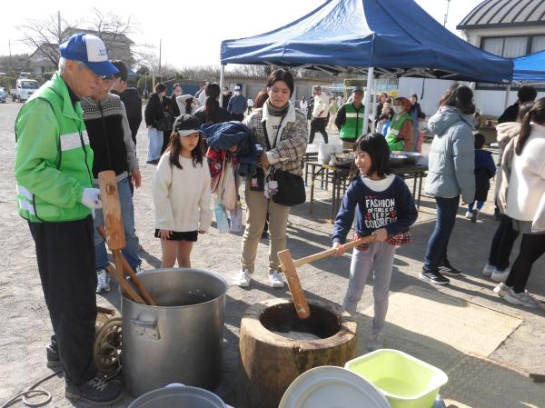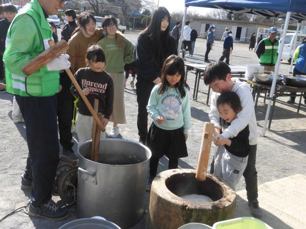 子供たちは、餅つき体験はもちろん、縄跳び大会やサッカーのストラックアウト、輪投げコーナーなどで楽しませてもらいました。そして参加者みんなで、つきたての餅や焼き餅、大鍋でつくったけんちん汁をいただきました。最後には、お待ちかねの「餅・菓子まき」が行われ、子供たちの元気な声と笑顔があふれました。