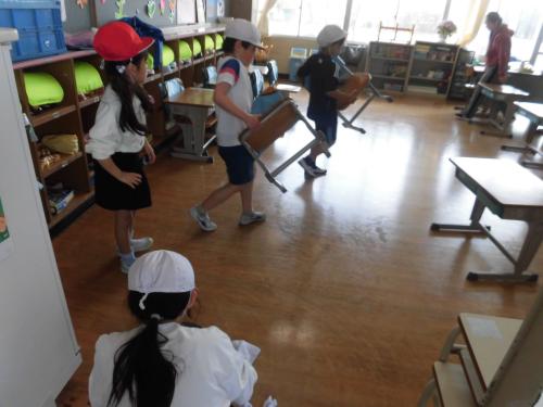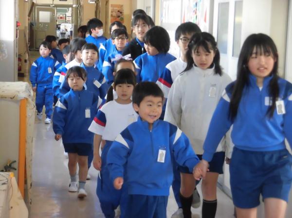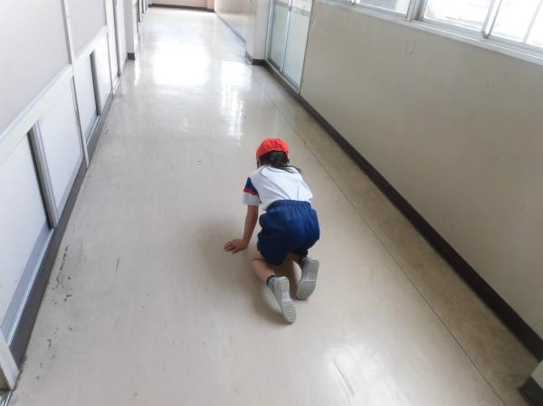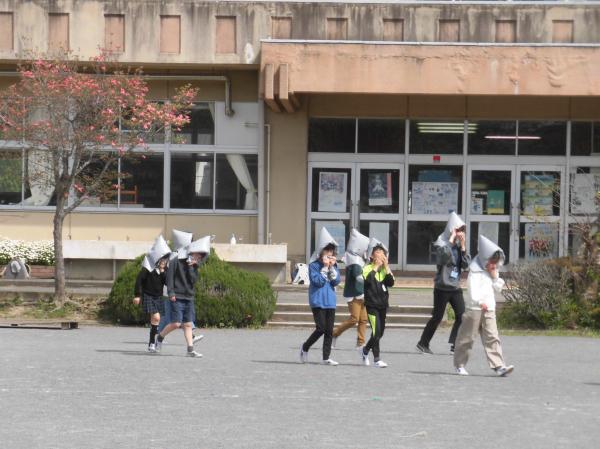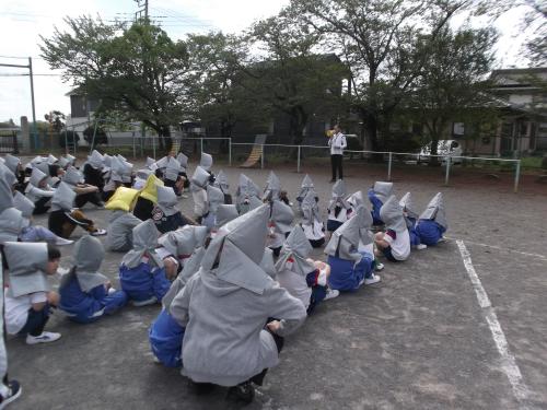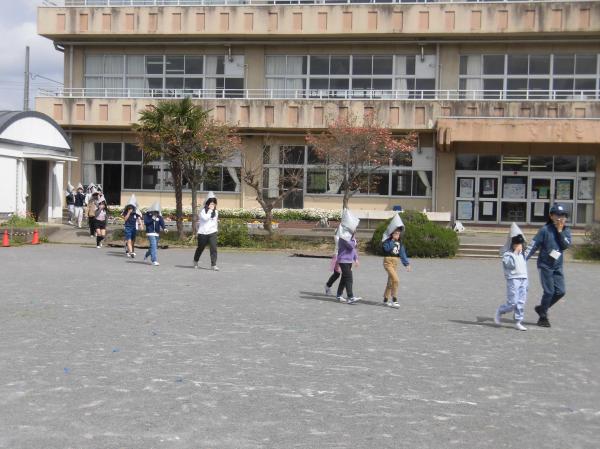 地震後に火災が発生したという想定で避難訓練が実施されました。「おかしも」の約束を守って全員安全に避難することができました。