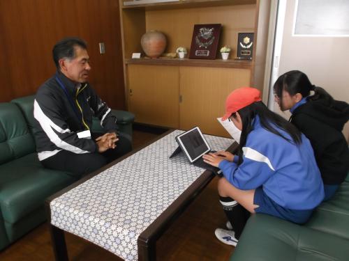 保健委員が先生方に健康についてのインタビューをしています。インタビューした内容はタブレットに入力し、写真を添えて掲示物にするそうです。