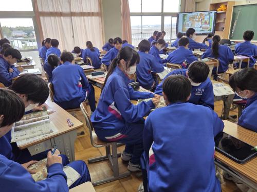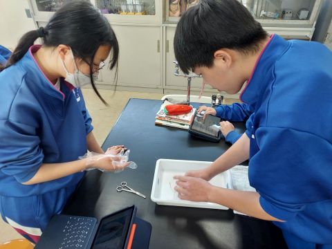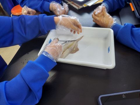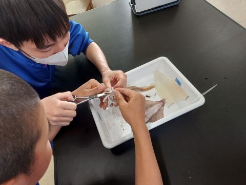 動物の体のつくりとはたらきを調べるために、各実験グループに用意したスルメイカを解剖しました。実際に解剖して調べることにより、実感を伴った理解につながったようです。