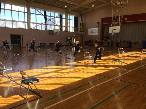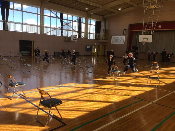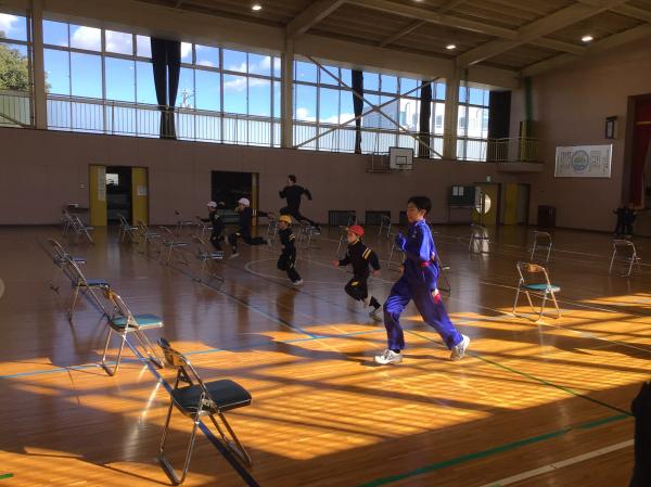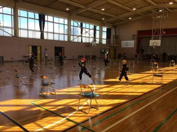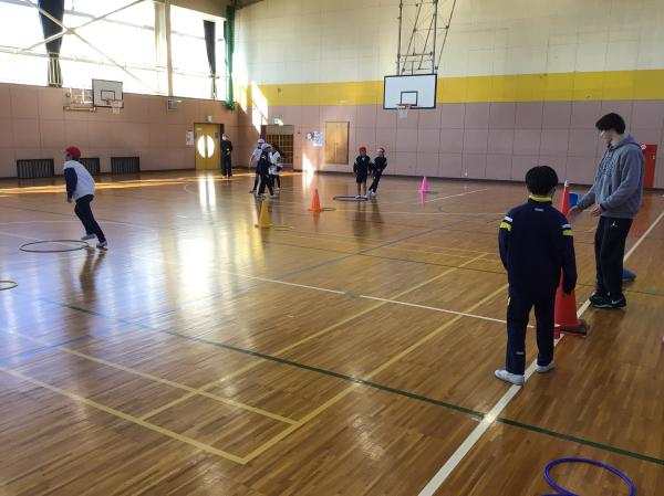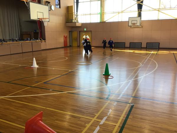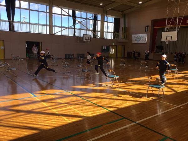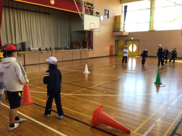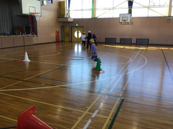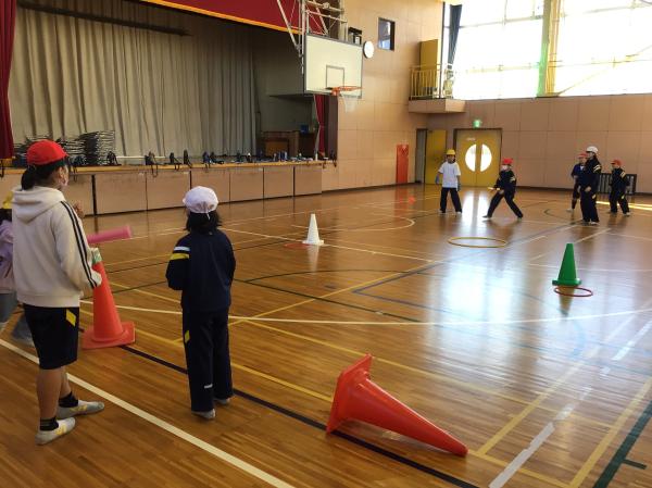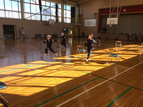 3年生の体育は、小型ハードル走に入りました。小型ハードルがないので、パイプ椅子と平ゴムを使って代用しています。準備も素早くできるようになりました。ゴムとゴムの間が、3メートルのコース、4メートルのコース、5メートルのコースに分かれています。同じリズムでハードルを越えることを目標にして、自分に合うコースを見つルために、いろいろ試していました。