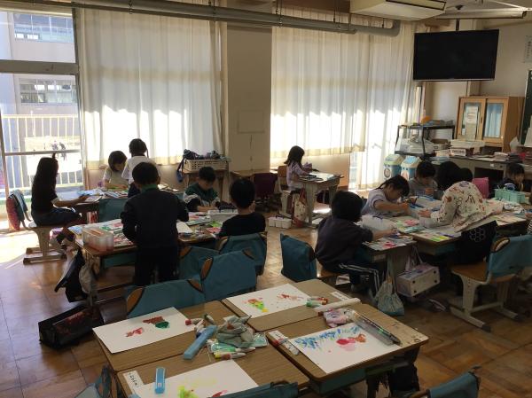 今日は、「お楽しみ会」で、ドッジボールやこおりおに、フルーツバスケットをしました。その後、絵の具と指を使って、好きな絵を描きました。楽しい時間となりました。
