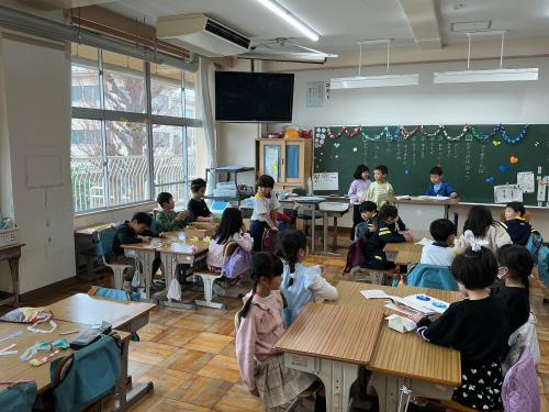 のこぎりを使った経験がほとんどない児童たち。「むずかしい〜」と言いながら、一生懸命木の棒を切っていました。今日はたくさんのパーツを作りました。次回はパーツをくっつけて、どんな形ができるか楽しみです。