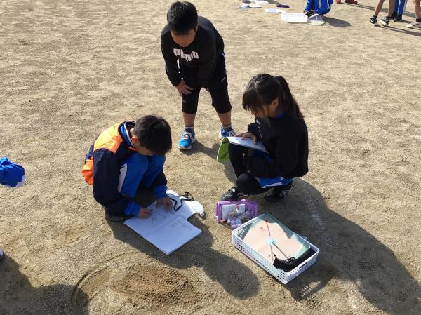 太陽とかげが見える方位を調べたり、温度計を使って日なたと日かげの地面の温度の差を測ったりしました。