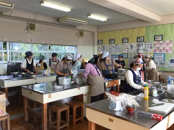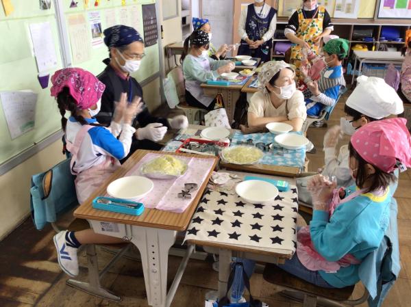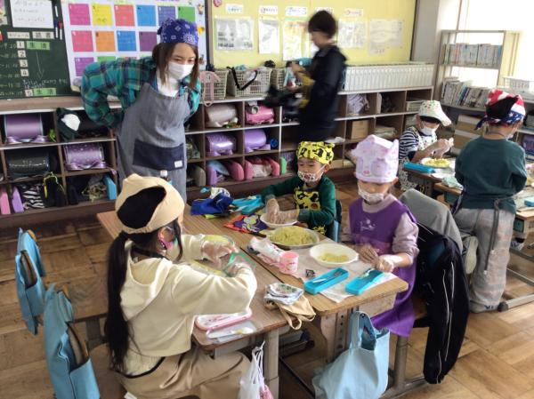 保護者ボランティアの方々にご協力いただき、いい匂いが充満した教室で、児童たちはスイートポテトの成形をしました。