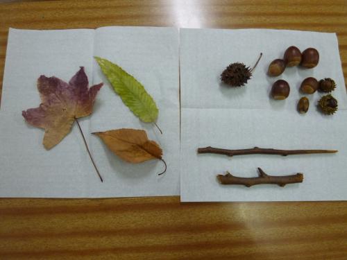公園で見つけた どんぐりや葉っぱ、木の枝など、秋のお宝を持ってきてくれました。