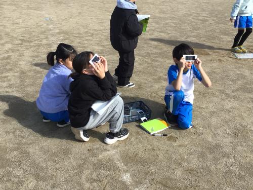 遮光プレートで太陽を見たときは、「オレンジ色だ!」「丸い!」など、とても盛り上がっていました。