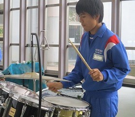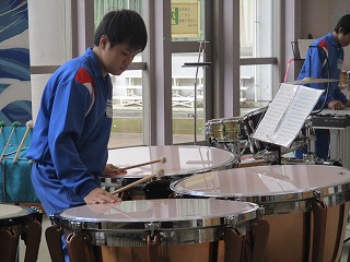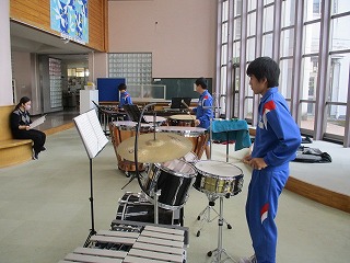 11月8日(土)午前11時30分、校舎1階の多目的スペース「ドリーム広場」では、打楽器を担当する3人の吹奏楽部員が、第60回茨城県アンサンブルコンテスト県南地区大会に向けて練習に励んでいた。