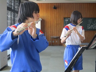 11月8日(土)11時40分、校舎3階の多目的室では、吹奏楽部の1、2年生が金管八重奏「Adventure to Infinite Sky」の練習に励んでいた。