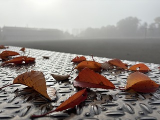 校庭では、霧に濡れた落ち葉が敷き詰められ、季節の移ろいを感じさせる風景が広がっていた。