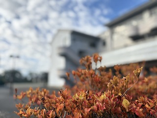 自転車置き場のドウダンツツジが紅葉、秋の深まりを演出