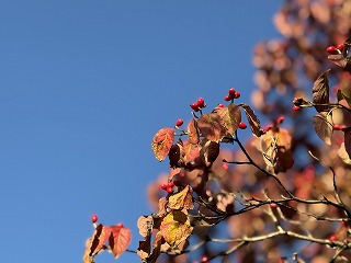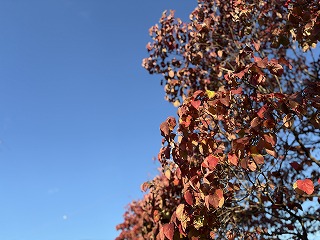 この日の朝は澄み渡る青空が広がり、紅葉したハナミズキの色合いが空に映えて、ひときわ美しい風景を作り出していた。