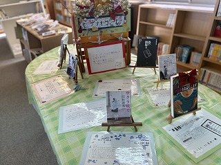 また、図書委員の生徒たちが手作りの飾りで彩った「ビブリオコーナー」も設置され、国語の授業で行われた「ビブリオバトル」で選ばれた本が紹介文とともに展示されている。