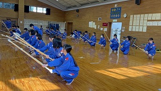 生徒竹刀を手に、凛とした姿勢で立ち、体育の教員の掛け声に耳を澄ませる。