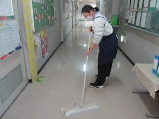 この日、保健室前の廊下では、用務員が黙々とモップがけを行い、床のほこりを丁寧に取り除いていた。