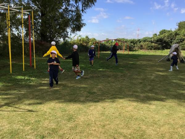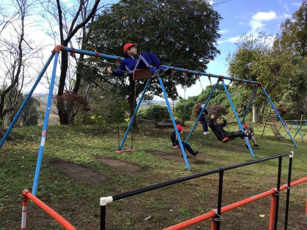 今日は、円になり、スキップ、歩く、ジャンプ、泳ぐなど、その動きと英単語を組み合わせ、「I can ( ).」というフレーズにのせて歌を歌いました。その後、他にできることを思い出し、英語で言うことも行いました。