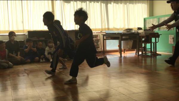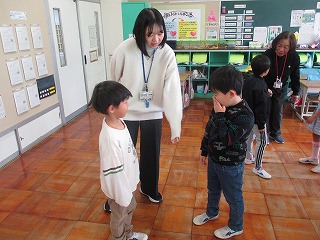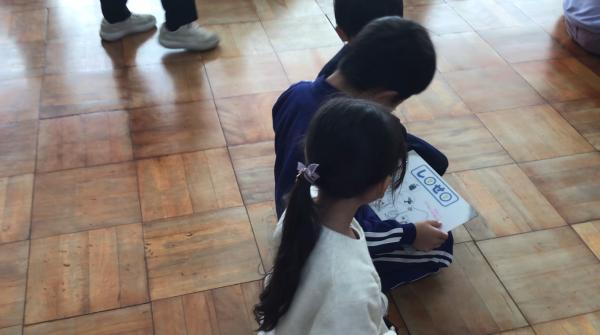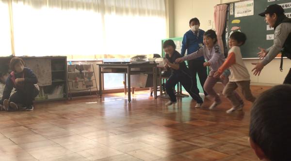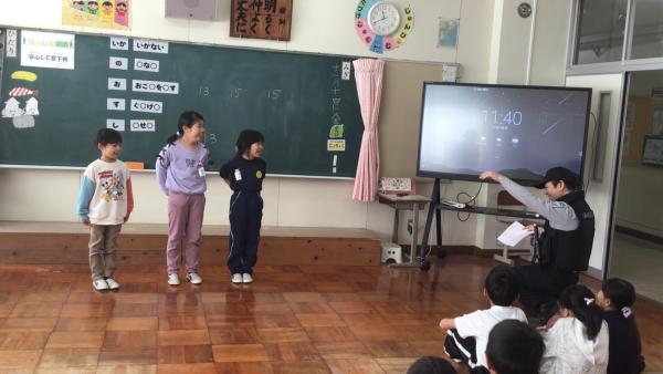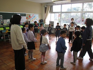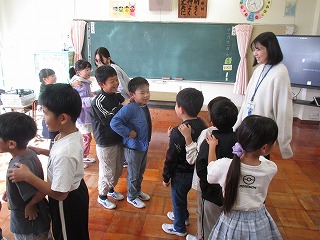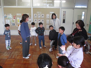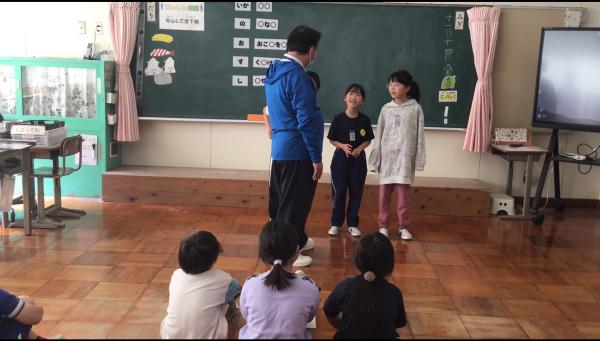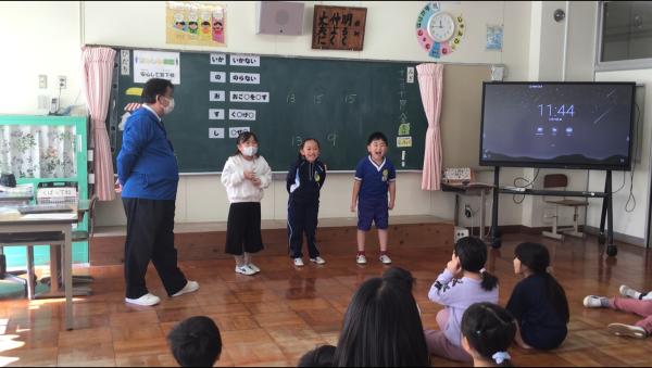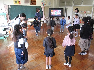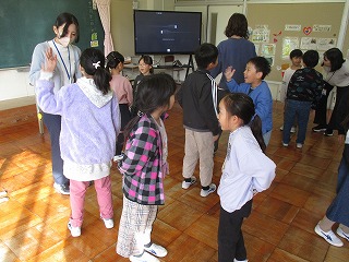 最後に、今日学習したフレーズを使いながら紹介し合い、じゃんけんをして負けた人が勝った人の肩に手を置く「じゃんけん列車」に取り組みました。笑顔で会話しながら、楽しくゲームを行う1・2年生の姿がありました。