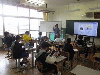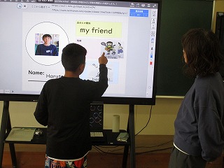 2校時、5年生はワールドルームに移動し、外国語の学習に取り組みました。今日は、友達のことを紹介しようということで、学習を進めていきました。