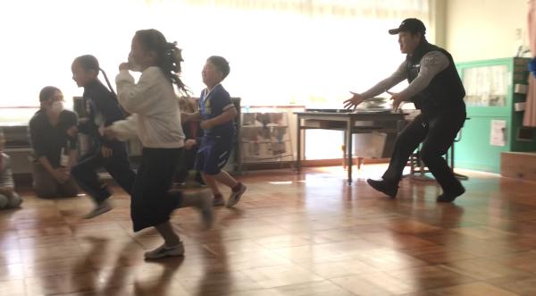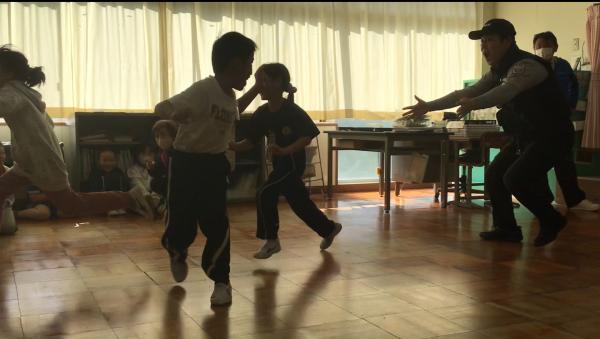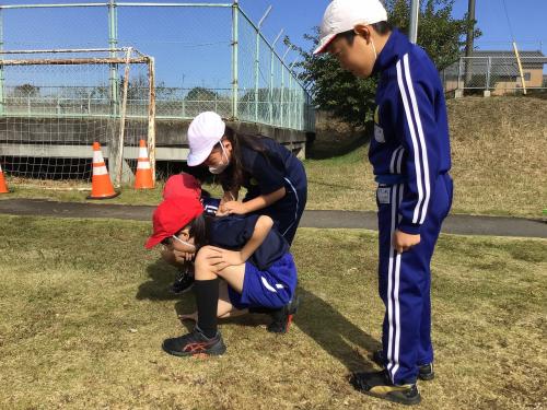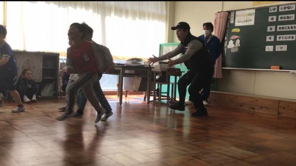 低学年では「安心して登下校」をテーマに不審者から逃げる練習や、大声で助けを求める練習を行いました。