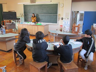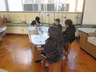2校時、4年生は理科室に移動し、理科の学習に取り組みました。今日は、「試験管を手で温めてみて気付いたことを話し合おう」というめあてを立て、学習を進めました。 実験では、試験管の口に石けんのまくをつくり、試験管を手で握ったり、やめたりしました。手で握り続けると、石けんのまくが割れてしまう班もあり、なぜそうなってしまうのかについて、児童たちは意見を出し合っていました。 4年生のみなさん、手で温めるとふくらんだり、冷やすと縮んだり、空気って不思議ですね!