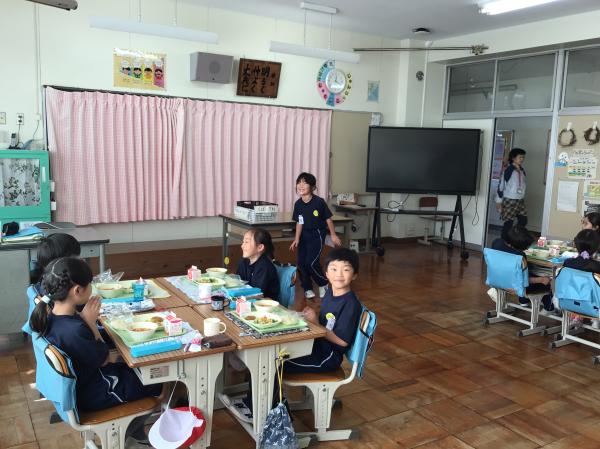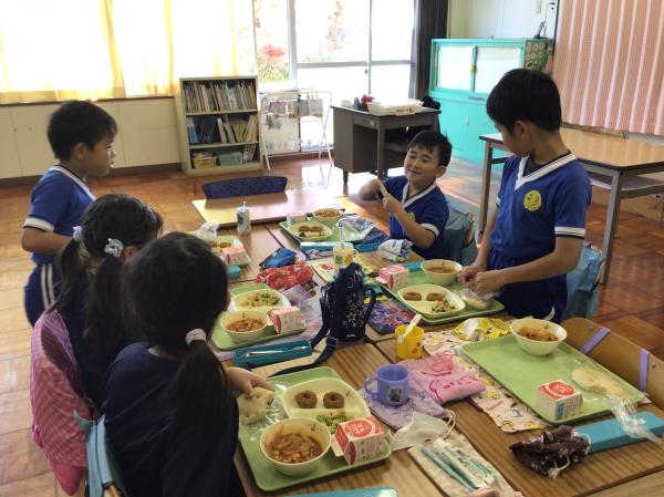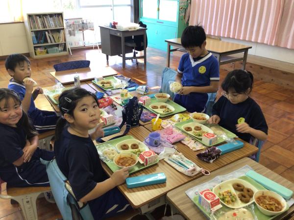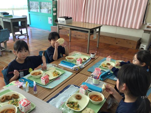 今日の給食 フォカッチャ 牛乳 あおさ入りイカリングフライ ブロッコリーとツナのサラダ ミネストローネ 1・2年生の給食の様子です。 フォカッチャの不思議な形に興味しんしんな様子でした。美味しくいただきました。