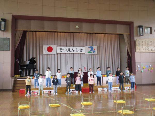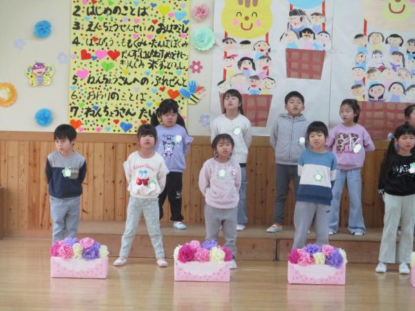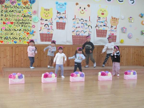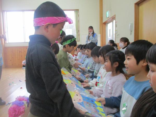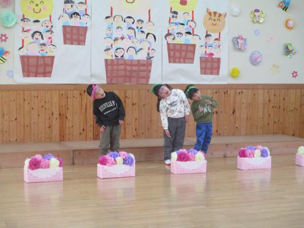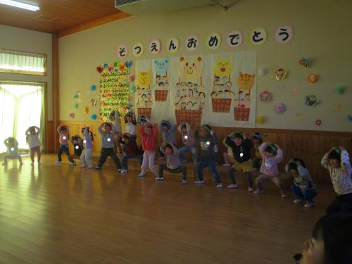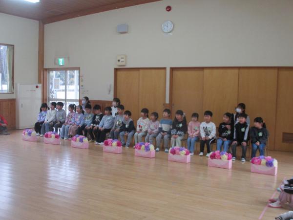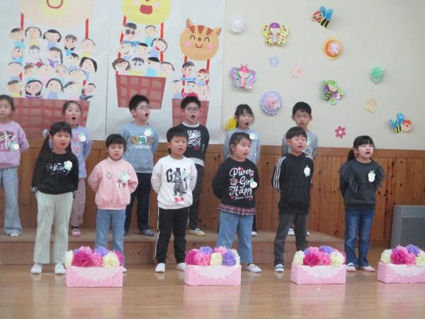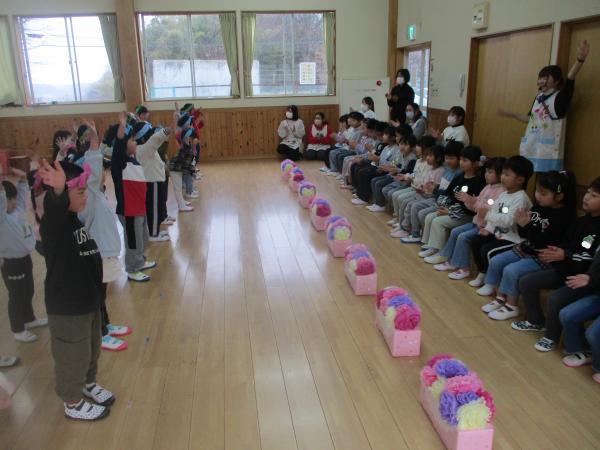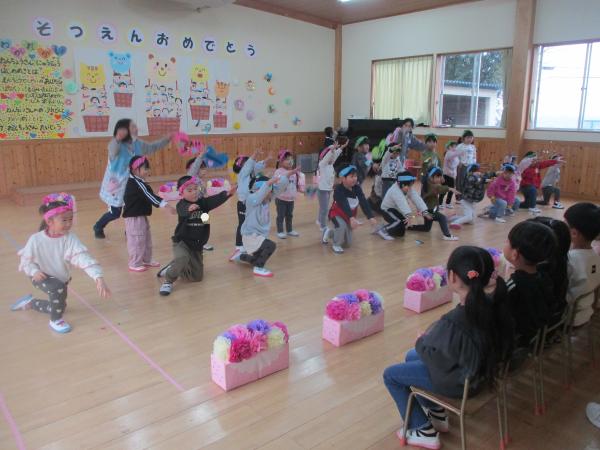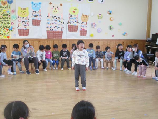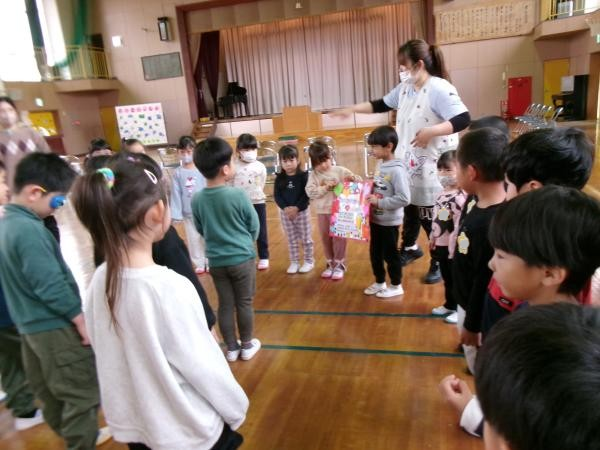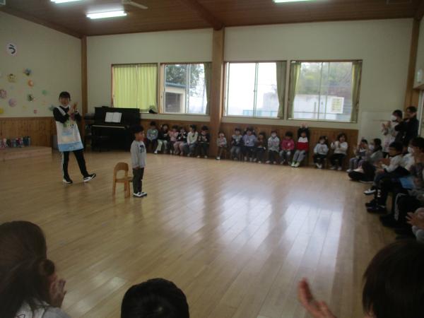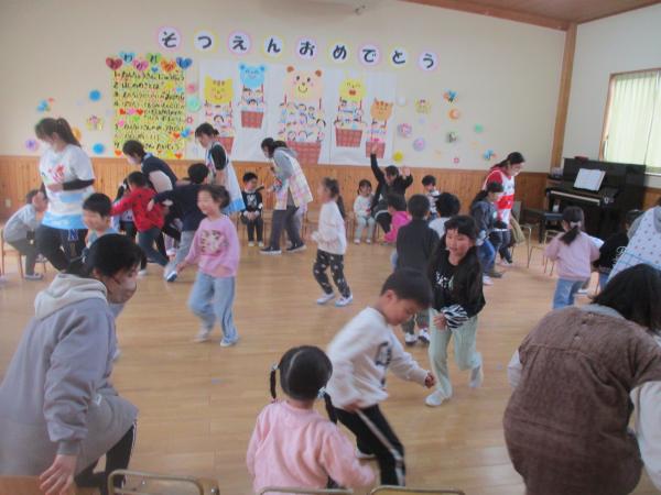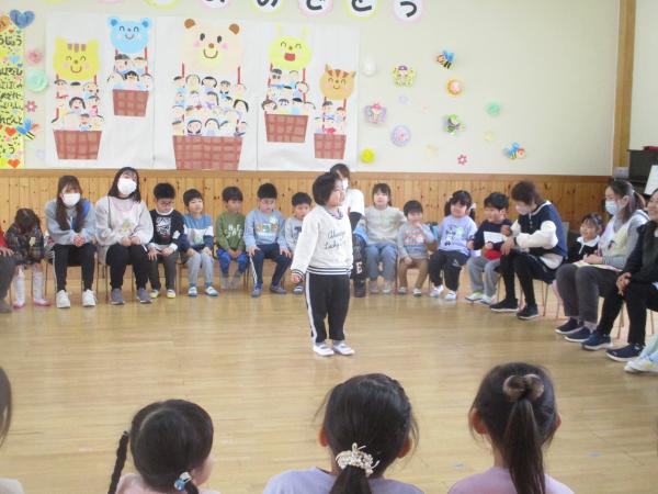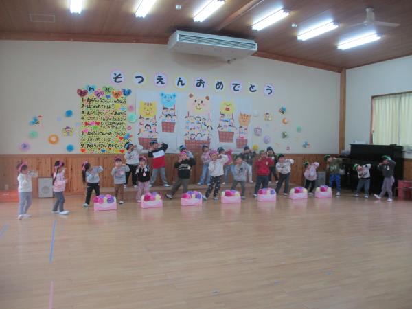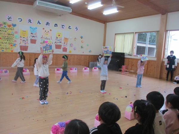この日を迎えるまでに年少さん、年中さんが秘密の準備をたくさんしてくれました😊今日はついに年長さんをご招待する日です🥰「喜んでくれるかな?」とドキドキワクワクでスタート✨司会進行は年中さんです!年少、年中さんからの出し物はダンス“ハピネスメドレー”🎶大好きとありがとうの気持ちをいっぱい込めて披露しました😊💗年長さんは感謝の気持ちを込めて歌「ずっといっしょ」を聴かせてくれました✨素敵な歌声に、成長の嬉しさとお別れの寂しさを感じました😭年中さんは素敵な写真たてのプレゼントもしてくれました✨互いを思い合う姿に、一人一人の大きな成長をたくさん感じることのできた素敵な会でした😌会終了後は、全学年でいす取りゲーム&フルーツバスケットを楽しみました😄🎶