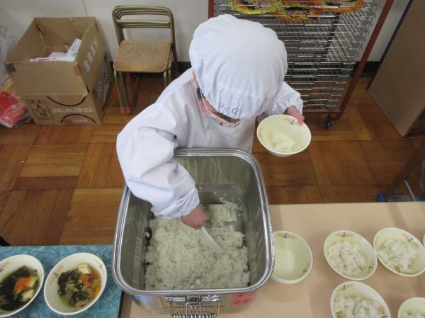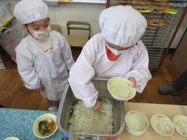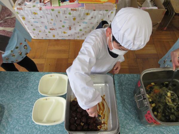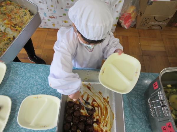 また、給食当番では、ご飯と肉団子の配膳を行いました✨