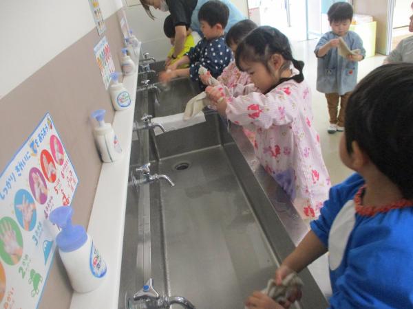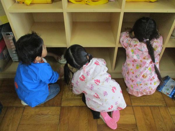「隠れてるかな~🎵」ときりん組まで年長さんを探しに行きましたが、「どじょうさんしかいない…😢」と年長さんが卒園したことを実感したようで、少し寂しそうなこども達😭