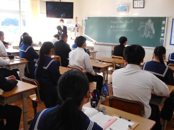 冬休みが終わり、昨日から元気な生徒の姿が学校に戻ってきました。部活動でも寒さに負けず、活動していした。年を越し、総合体育大会まで約半年となりました。この冬で大きく成長できるように活動できる時間を大切にし、取り組んでいってほしいです。