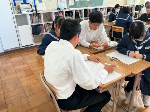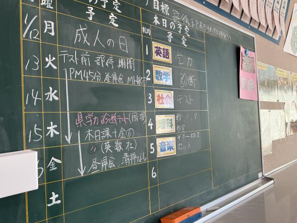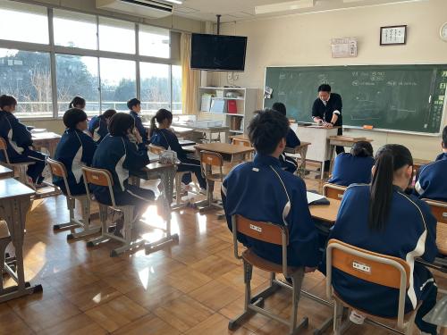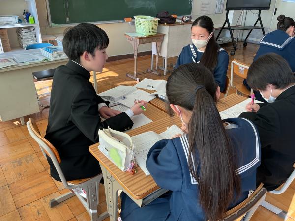 本日、2日間で行われた1・2年生の県学力診断のためのテストの日程が終了しました。終了後、生徒たちは学習してきた結果を出し切れたり、悔しがっていたりと様々な思いが溢れていました。4時間目からは、通常授業に戻り、友達と協力して学習を楽しんで取り組んでいました。 3年生では、今週から私立の一般入試が始まり、受験した高校の問題を解き直していました。きちんと振り返りを行い、次に繋げていってほしいです。