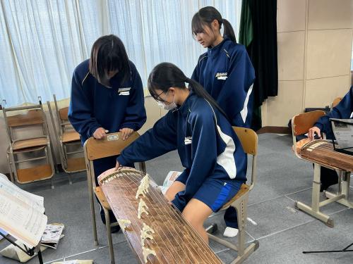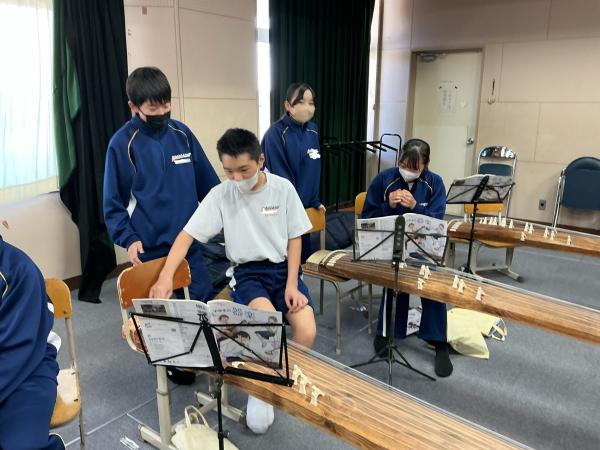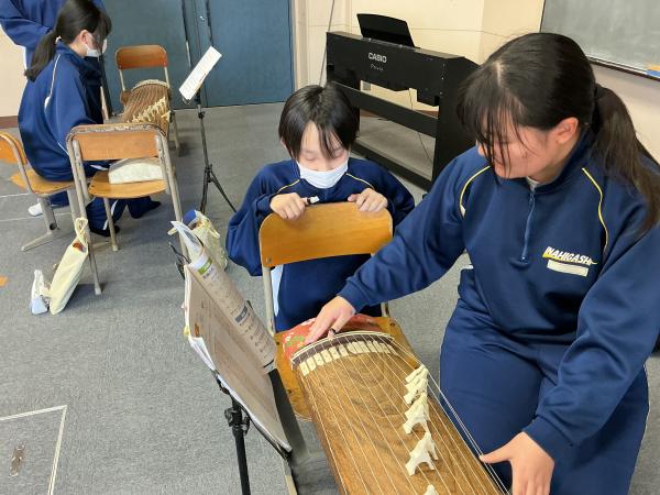 1年生の音楽の授業では、筝について学習しています。 楽器の仕組みと奏法を学び、実際に一曲通して演奏できるよう、友達と協力して進めているところです。 貴重な体験ですのでぜひ楽しく学んでいってほしいです。
