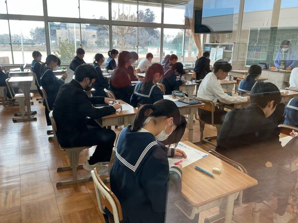 3年生の授業では、3年間の学習の振り返りを行なっていました。茨城県立高等学校学力検査まで残り16日となり、プリントを活用して重要な言葉などを確認していました。限られた残りの時間を大切に、そして有効的に活用し、良い準備をしてください。良い結果を得るためには、良い準備が必要です。受検当日に「自分はこれだけやってきたから大丈夫」と自信をもって臨めるようにやるべきことを徹底して取り組んでいきましょう。