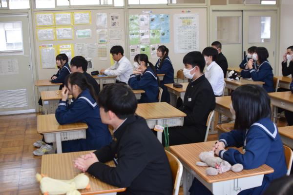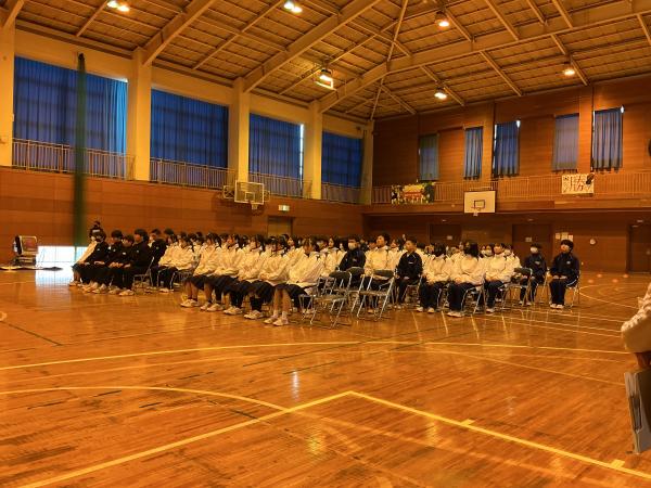 本日、間もなく卒業を迎える3年生で、校長先生による特別授業が行われました。校長先生の経験を踏まえたお話を聞きました。卒業はゴールではなく新たなスタートであること、そして新たなスタートを切った後の自分の人生にどう向き合っていくかを一人一人がしっかりと考えられたことと思います。 また、3年生だけでなく1・2年生も卒業式の練習が始まりました。先輩が気持ちよく旅立つことができるよう全員が1つになって取り組んでいます。