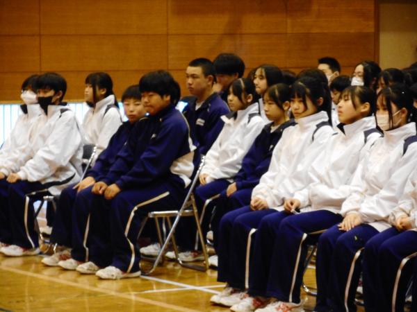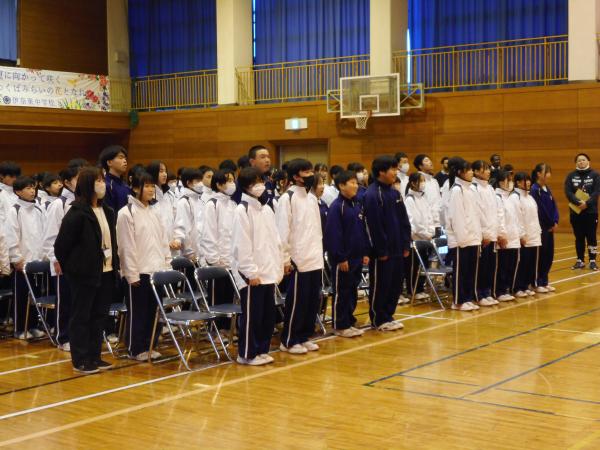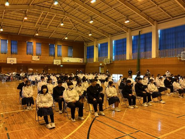 本日から卒業式に向けて、全学年での練習が始まりました。3年生は、堂々とした姿勢で本番を想定して取り組むことができました。1年生と2年生も式にふさわしい態度で臨むことができました。卒業式を素晴らしい式にするためには、後輩たちの力も必要です。来週の火曜日、3年生にとって記憶に残る1日になるように、全校生徒で良い卒業式を作り上げていきましょう。