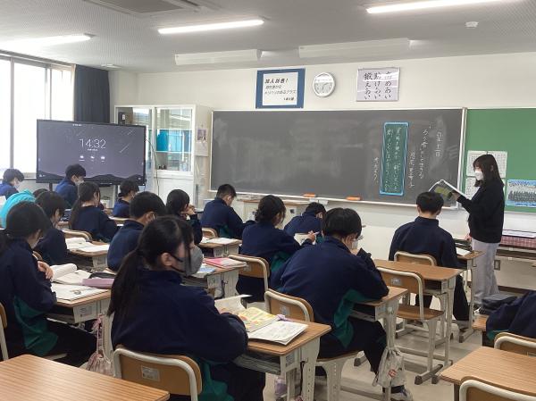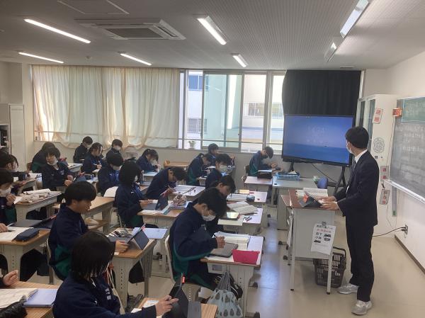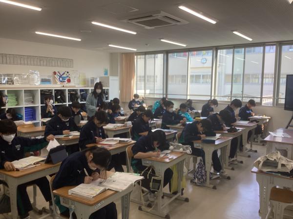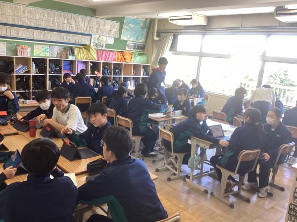 1年生の各教室では、それぞれの教科の学習が進められています。副教材であるワークを活用して、学習内容の定着を図ったり、タブレットを用いて、学習内容をワークシートに丁寧にまとめたりする姿がありました。スキー宿泊学習を終えて、その表情も頼もしくなってきたように思います。あと一か月後には先輩です。後輩たちとどんな学校を創造していくのか、楽しみにしています。