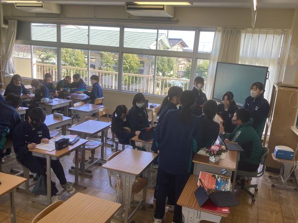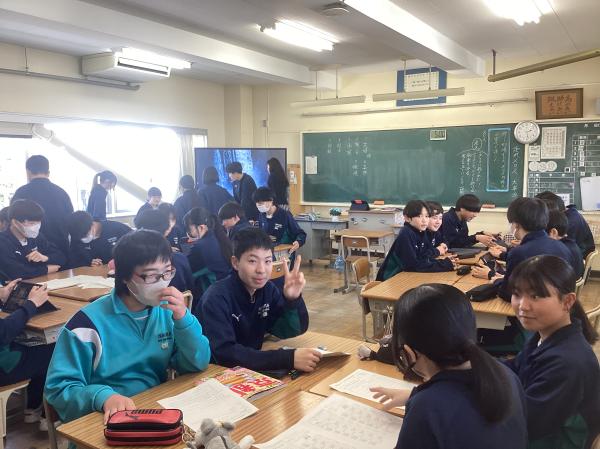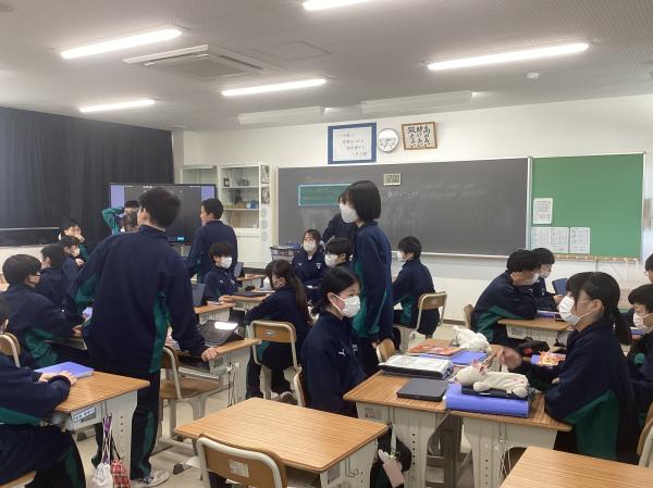 2年生の教室では修学旅行のタクシー班別学習について、話合い活動が行われていました。伏見稲荷や清水寺など人気スポットを巡ったり、忍者体験をするために、電話予約をしたりと事前の準備が入念に行われています。修学旅行の出発は4月26・27・28日です。互いに協力し合って、充実した活動につながるように期待しています。