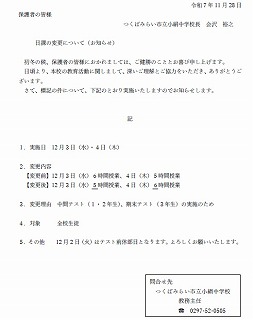 〇文書「日課の変更について(お知らせ)」(令和7年11月28日)