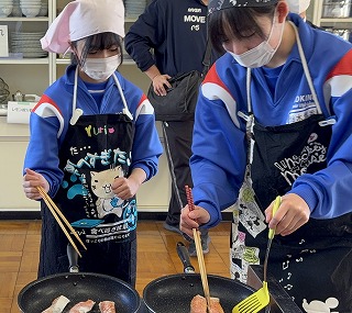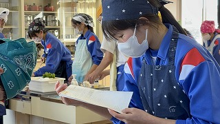 調理室では、1年1組の生徒が調理実習。