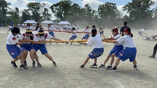 運動場の中央に置かれた竹を取り合い、自分の陣地に運びます。