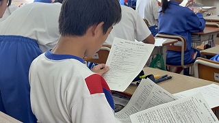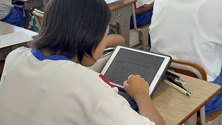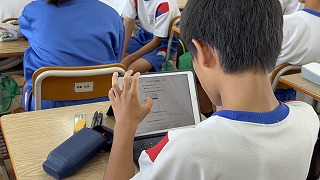 生徒は、印刷されたプリントや、学習用タブレット端末で「いばらきっ子郷土検定ウェブサイト」を使って、過去問題を挑戦していた。