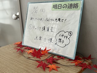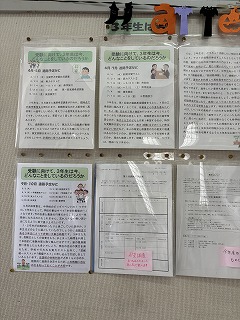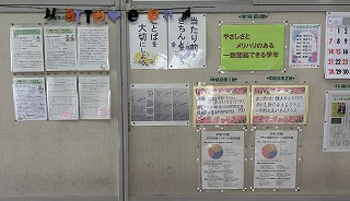 ハロウィーンや紅葉した葉も掲示物に添えられており、掲示物を通して生徒に伝えたいという主任の思いが伝わってくる。