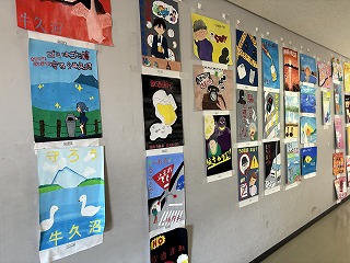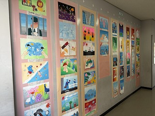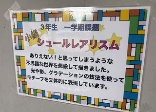 1階調理室前の廊下では、3年生が1学期に制作した美術作品を展示しています。
