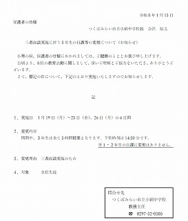 〇文書「三者面談実施に伴う3年生の日課等の変更について(お知らせ) 」(令和8年1月15日)