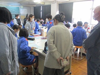 教室からは真剣なまなざしで授業に取り組む中学生の姿が見られ、小学生たちは興味津々にその様子を見つめていた。