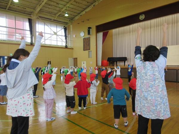 今回のみんなで体操は、運動会の遊戯として、ぞう組の『あいうえおんがく🎵』と、すみれ組の『ココロオドルほうで🎵』を踊りました🕺