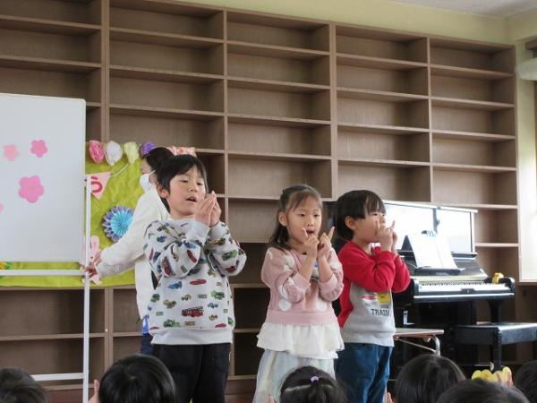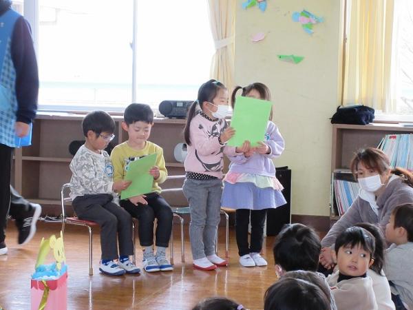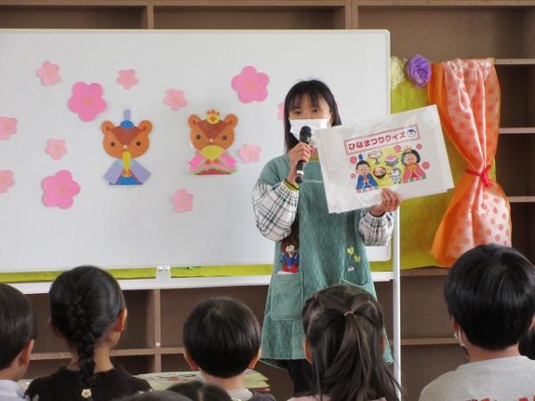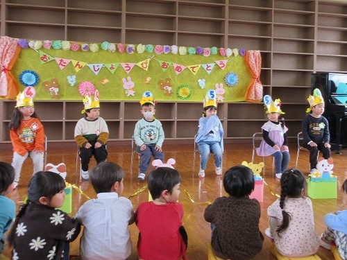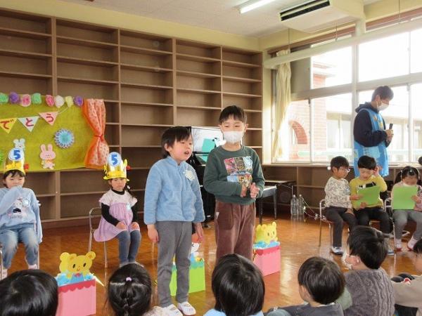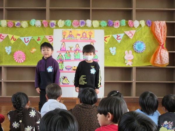 今日は、2月・3月生まれのお友達の誕生会でした。嬉しいような恥ずかしいような様子で、ニコニコ😚していました。質問への回答は、しっかりと自分なりの答えを考えて言うことができていましたよ!全園児で取り組んだ、ひな祭りクイズでは、答えが当たると大盛り上がり!!何となく、ひな祭りのことが分かったかな🎎 今日の誕生会をもって、全員のお祝いを終えることができました。みんな、大きくなったね✨これからも、元気で健やかな成長を願っていますよ🌈次回は、4月生まれのお友達。楽しみにしていてね~🌸
