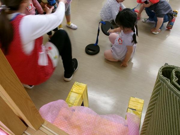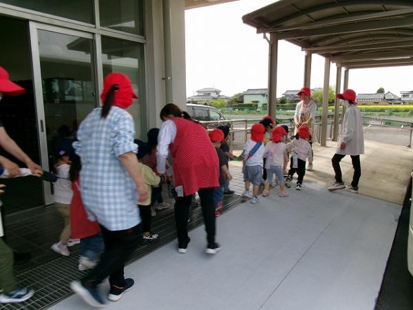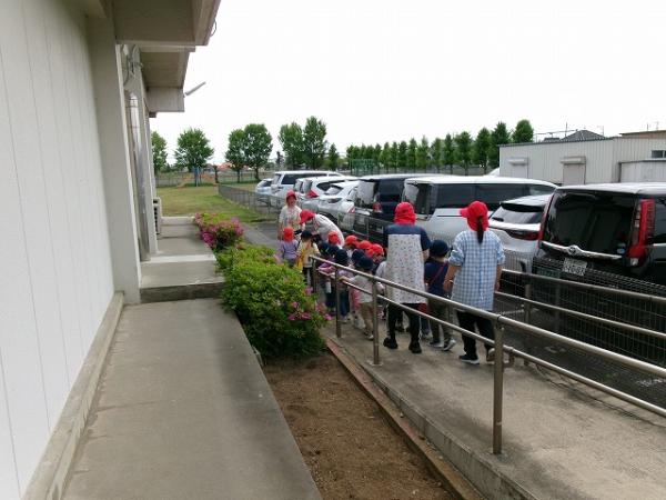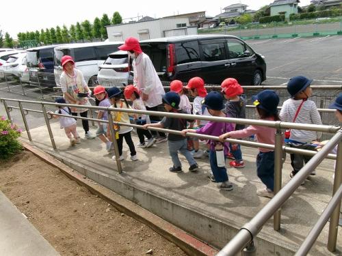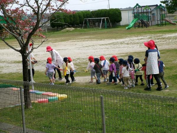年少さんのいちご組は、間隔を取るためのロープを使ってお外にお散歩です。たくさんの春を見つけましょう🌸