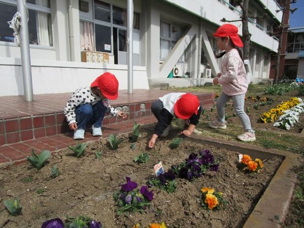 日中は春の暖かさを感じるような温かい1日でしたね☀️戸外で体操をして、元気いっぱいに体を動かしたり、園庭の畑や花壇の草取りをしたりしました✨(*^▽^*)花壇のチューリップ🌷が咲いているのを見つけて、「かわいい💗」と歓声があがっていました~(^O^)/🎵🎵